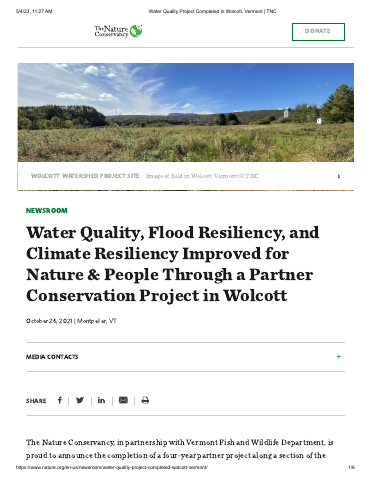 In Wolcott, VT at the confluence of the Lamoille River and a tributary of the Wild Branch River is a 22.5-acre floodplain managed by the Vermont Fish & Wildlife Department. After the expiration of agricultural leases on this site, local, state, and regional organizations collaborated to increase wildlife connectivity, reduce flood risks, and restore the natural floodplain. Early wildlife camera monitoring showed a diversity of wildlife nearby that were crossing over Route 15 in an unsafe location just north of the parcel. Additionally, the land under the bridge was covered with large rocks that made walking difficult for some species. Concrete abutments supporting the Fort Hill bridge also contributed to the problem by causing ice damming, increasing the flood risk, and further restricting wildlife movement. In 2018 a collaborative effort to address multiple values of the Wild Branch site began. In just four years a new wildlife shelf under the Rt. 15 bridge was constructed, the Fort Hill Bridge was removed to reduce flooding, and 2,000 stems were planted to begin the restoration of the natural floodplain. The Nature Conservancy's Vermont Chapter played a critical role in project management throughout. Ultimately, multiple partners working together allowed for several goals to be met with one concerted effort.