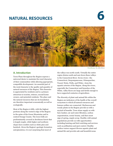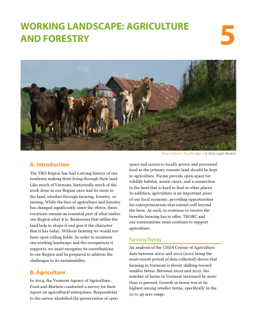 The Two-Rivers Ottauquechee Regional Commission (TRORC) adopted their 2020 regional plan to guide its thirty member municipalities in protecting natural resources, maintaining working landscapes, and preventing forest fragmentation. The plan is a visionary policy statement on development, improvement, and conservation of the region’s most valued resources. Working landscapes make up a great deal of this region and the plan provides recommendations on reducing fragmentation and parcelization while encouraging ecologically sound forestry management practices. Several regulatory and nonregulatory strategies are offered for towns to implement when promoting sustainable agriculture and forestry. These strategies range from tools like cluster development and overlay districts to voluntary participation in the Current Use Program. Specific natural resource goals are outlined, and the region's highest priority landscape, community, and specie scale components are identified. Through large scale conservation the landscape will remain intact, connected, and diverse and allow for wildlife movement and adaptation in the face of climate change. The TRORC regional plan is adaptable to meet the changing needs of the towns it serves. The commission will continue to integrate the best available science through partnerships with non-profits and state agencies.