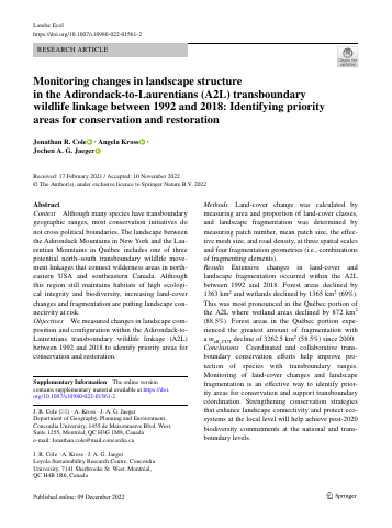 Although many species have transboundary geographic ranges, most conservation initiatives do not cross political boundaries. The landscape between the Adirondack Mountains in New York and the Laurentian Mountains in Québec includes one of three potential north-south transboundary wildlife movement linkages that connect wilderness areas in northeastern USA and southeastern Canada. Although this region still maintains habitats of high ecological integrity and biodiversity, increasing land-cover changes and fragmentation are putting landscape connectivity at risk. We measured changes in landscape composition and configuration within the Adirondack-to-Laurentians transboundary wildlife linkage (A2L) between 1992 and 2018 to identify priority areas for conservation and restoration. Land-cover change was calculated by measuring area and proportion of land-cover classes, and landscape fragmentation was determined by measuring patch number, mean patch size, the effective mesh size, and road density, at three spatial scales and four fragmentation geometries (i.e., combinations of fragmenting elements). Extensive changes in land-cover and landscape fragmentation occurred within the A2L between 1992 and 2018. Forest areas declined by 1363 km2 and wetlands declined by 1365 km2 (69%). This was most pronounced in the Québec portion of the A2L where wetland areas declined by 872 km2 (88.5%). Forest areas in the Québec portion experienced the greatest amount of fragmentation with a meff_CUT decline of 3262.5 km2 (58.5%) since 2000. Coordinated and collaborative transboundary conservation efforts help improve protection of species with transboundary ranges. Monitoring of land-cover changes and landscape fragmentation is an effective way to identify priority areas for conservation and support transboundary coordination. Strengthening conservation strategies that enhance landscape connectivity and protect ecosystems at the local level will improve post-2020 biodiversity commitments at the national and transboundary levels.