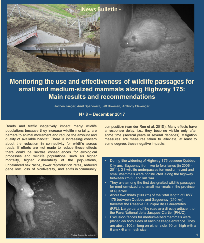 During the widening of Highway 175 between Québec City and Saguenay from two to four lanes (in 2006 - 2011), 33 wildlife underpasses for medium-sized and small mammals were constructed along the highway between km 60 and km 144. They are among the first designated wildlife passages for medium-sized and small mammals in the province of Québec. About two thirds (133 km) of the total length of HWY 175 between Quebec and Saguenay (210 km) traverse the Réserve Faunique des Laurentides (RFL). Large parts of the road are directly adjacent to the Parc National de la Jacques-Cartier (PNJC). Exclusion fences for medium-sized mammals were placed on both sides of each passage entrance. They are about 100 m long on either side, 90 cm high with a 6 cm x 6 cm mesh size. The research project had the following objectives: (1) To characterize the locations and rates of vehicle collisions with medium-sized and small mammals and to evaluate the changes in the frequency of highway-related mortality due to migration measures. (2) To determine the performance of the four types of wildlife passages for medium-sized and small mammals. (3) To assess how well the mitigation measures provide for the permeability of the highway for individuals and for gene flow across the road, with a focus on the American marten. The implementation of 33 wildlife passages for small and medium-sized fauna along HWY 175 represents an important step in the right direction. The results of this study demonstrate a major success for the existing wildlife passages along HWY 175. Based on the results, we provide 16 recommendations, 9 of which relate to possible improvements of road mitigation measures and 7 relate to monitoring and research. Some of them include (for the complete list see the final report): • Use of a variety of types of wildlife passages and exploration of some new passage types for porcupines, red foxes, river otters, snowshoe hares, American martens, fishers and Canada lynx is recommended. • Box culverts with a concrete ledge seem to be less effective than the pipe culverts and box culverts with a wooden ledge. For example, the average number of complete crossings per passageway was 183.3 individuals for PC-type passages, followed by 139.5 individuals for WLC-type passages, and the lowest was recorded for CLC-type passages with 27.6 individuals. Adding sheets of wood onto the concrete surface of their ledges could improve their performance. • Passageways should preferably be constructed without an opening in the median. • Increasing the vegetation cover between the forest and the entrances of the passageways is recommended, while forest removal should be avoided in the sections in which wildlife passages will be installed. • Addition of wildlife passages (with fences) at mortality hotspots and at locations where vegetation is close to the road should be considered, e.g., when a regular drainage culverts is repaired or replaced, this is a good opportunity for transforming it into a wildlife passage. • We recommend establishing norms and standards for road mitigation in Quebec. • Good maintenance of the current fences is recommended. • New wildlife passages should be combined with fences much longer than 100 m on either side. • Fencing of road sections with mortality hotspots and the extension of existing fences to the next drainage culverts should be considered. • Improvements in fence design would be useful, e.g., to address the fence-end effect. • A study about the influence of the length of the fences on mortality at fence-ends would be desirable. Fences should be long enough that the increased road-kill numbers at the fence- ends (due to the displacement of crossing attempts of the animals) are compensated by sufficiently long fenced sections of the road in which road-kill numbers are low. • Continued monitoring of the use of the existing wildlife passages can determine if more species habituate to the passages. • Monitoring of the use of regular drainage culverts would be highly useful to determine if they could perhaps be as effective as wildlife passages if some fencing for medium-sized fauna were added. Making good use of the large research potential of HWY 175 can make an important contribution to improved knowledge about the effectiveness of road mitigation. HWY 175 is particularly suitable for such research for several reasons, e.g., our study provides 4 years of baseline data about small and medium-sized mammals, which is a rare opportunity, and because the high numbers of animals being killed on HWY 175 result in larger sample sizes and in faster detection of the wildlife responses to modifications to the mitigation measures than in areas with lower wildlife mortality.
