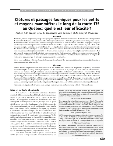 Lors de l’élargissement de deux à quatre voies de la route 175 (de 2006 à 2011) entre les villes de Québec et de Saguenay, 33 passages fauniques inférieurs ont été mis en place entre les km 60 et 144. Ils comptent parmi les premiers passages fauniques au Québec conçus spécifiquement pour les mammifères de petite et de moyenne taille. Près des deux tiers (133 km) de la longueur totale de la route 175 entre Québec et Saguenay (210 km) traversent la Réserve Faunique des Laurentides (RFL). De longs tronçons routiers avoisinent directement le parc national de la Jacques-Cartier (PNJC). Des clôtures d’exclusion pour la faune de taille moyenne ont été installées de part et d’autre de chaque entrée de passage. Elles mesurent environ 100 m de longueur de chaque côté et 90 cm de hauteur avec une taille de mailles de 6 cm X 6 cm. Le projet de recherche comporte trois objectifs principaux : (1) Caractériser les sites et les taux de collisions entre les véhicules et les mammifères de petite et moyenne taille afin d'évaluer d'effet des mesures d'atténuation qui ont été mises en place sur l'incidence de la mortalité routière. (2) Évaluer l'efficacité des quatre types de passages fauniques concus pour les mammifères de petite et moyenne taille. (3) Évaluer dans quelle mesure les mesures d'atténuation assurent une perméabilité adéquate de la route aux individus et au flux génétique de part et d'autre de la route, avec un intérêt particulier pour la martre d'Amérique. La mise en place le long de la route 175 de 33 passages pour les mammifères de petite et moyenne taille s’avère une étape importante dans la bonne direction. Les résultats de la présente étude sur l’utilisation des nouveaux passages fauniques démontrent que c’est une réussite pour ceux déjà aménagés le long de la route 175. Nous formulons seize recommandations d’après les résultats obtenus, neuf d’entre elles concernent des améliorations possibles à apporter aux mesures d’atténuation ainsi que sept se rapportent au suivi et à la recherche. Parmi ces recommandations (pour la liste complète, consultez le rapport final) : • Avoir recours à plusieurs types de passages fauniques et en explorer de nouveaux pour le porc-épic d’Amérique, le renard roux, la loutre de rivière, le lièvre d’Amérique, la martre d’Amérique, le pékan et le lynx du Canada. • Les ponceaux avec tablette de béton semblent être moins efficaces que les ponceaux secs ou les ponceaux avec tablette de bois. Par exemple, le nombre moyen de franchissements complets par passage s’élevait à 183,3 individus pour les PS, suivi de 139,5 pour les PTBois. La valeur la plus basse enregistrée soit 27,6 était associée aux PTBét. L’installation des panneaux de bois sur la surface de béton pourrait améliorer leur efficacité. • Installer des passages continus, sans ouverture dans le terre-plein central, si c’est possible. • Accroître le couvert végétal entre la forêt et les entrées de passages. Éviter la coupe d’arbres non- essentielle à proximité des lieux d’aménagement de passages fauniques. • L’ajout de passages fauniques (avec clôtures) dans les zones de concentration de mortalités (« points chauds ») et aux endroits dont le couvert forestier se trouve près de la chaussée est recommandé; p. ex., lorsque des travaux de réparation ou de remplacement sont effectués sur des ponceaux de drainage réguliers, il s’agit d’une bonne occasion de les transformer en passages fauniques. • Nous recommandons d’implanter des normes sur les mesures d’atténuation associées aux routes au Québec. • Un bon entretien des clôtures déjà en place est recommandé. • De nouveaux passages fauniques devraient être annexés d’un côté comme de l’autre à des clôtures beaucoup plus longues que 100 m. • Considérer l’installation de clôtures aux « points chauds » et de prolongement des clôtures existantes jusqu’au ponceau de drainage suivant. • Procéder à des améliorations sur la conception des clôtures, en particulier pour réduire l’effet de l’extrémité de clôture. • Réaliser des études sur l’influence de la longueur des clôtures sur la mortalité routière et les effets des extrémités. Des clôtures assez longues doivent être installées pour que les nombres plus élevés de mortalité trouvés aux extrémités de clôture sur les routes (à cause du déplacement des tentatives de franchissement) soient compensés par une réduction de la mortalité liée aux segments clôturés où les cas de mortalité s’avèrent faibles. • Poursuivre le suivi de l’utilisation des passages faunique pour déterminer si plus d’espèces s'accoutument à ceux-ci. • Un suivi de l’utilisation des ponceaux de drainage réguliers par la faune peut servir à déterminer si ces ponceaux peuvent devenir aussi efficaces que les passages fauniques en y installant des clôtures. Utiliser à bon escient le grand potentiel de la route 175 pour des travaux de recherche peut contribuer de façon importante à l’amélioration des connaissances sur l’efficacité des mesures d’atténuation. La route 175 convient à plusieurs égards comme zone d’étude, p. ex., notre étude fournit l’équivalent de 4 années de données de référence concernant les mammifères de petite et de moyenne taille, ce qui en soi constitue une rare opportunité. Les dénombrements élevés de mortalités routières sur la route 175 permettent alors de générer des résultats sur des échantillons plus importants de même que de déceler avec davantage de rapidité les réactions des animaux à la suite d’une modification apportée aux mesures d’atténuation.
