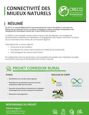 Afin de conserver un réseau fonctionnel dans un cadre d’adaptation aux changements climatiques, le CRECQ a cartographié en 2019 les corridors naturels au Centre-du-Québec ainsi que les noyaux de conservation. En 2021, le CRECQ débute des projets de consolidation de la connectivité sur le territoire centricois. Un corridor en milieu agricole a été identifié en priorité avec les acteurs municipaux. Ce corridor situé dans la MRC de Nicolet-Yamaska est majoritairement aquatique. Les principaux objectifs de ce projet sont : - Réalisation de caractérisation de terrain chez des propriétaires ciblés dans le corridor - Rencontre de propriétaires intéressés par la réalisation d’aménagements concrets soutenant la connectivité - Réalisation d’aménagements.