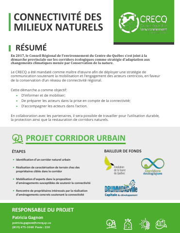 Afin de conserver un réseau fonctionnel dans un cadre d’adaptation aux changements climatiques, le CRECQ a cartographié en 2019 les corridors naturels au Centre-du-Québec ainsi que les noyaux de conservation. En 2021, le CRECQ débute des projets de consolidation de la connectivité sur le territoire centricois. Un corridor en milieu urbain a été identifié en priorité avec les acteurs municipaux. Ce corridor situé dans la Ville de Drummondville est à la fois aquatique et terrestre. Les principaux objectifs de ce projet sont : - Réalisation de caractérisation de terrain chez des propriétaires ciblés dans le corridor - Rencontre de propriétaires intéressés par la réalisation d’aménagements concrets soutenant la connectivité - Réalisation d’aménagements.